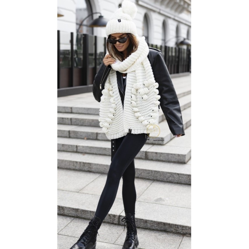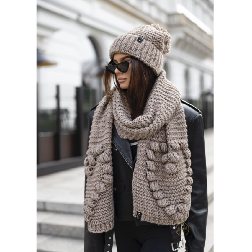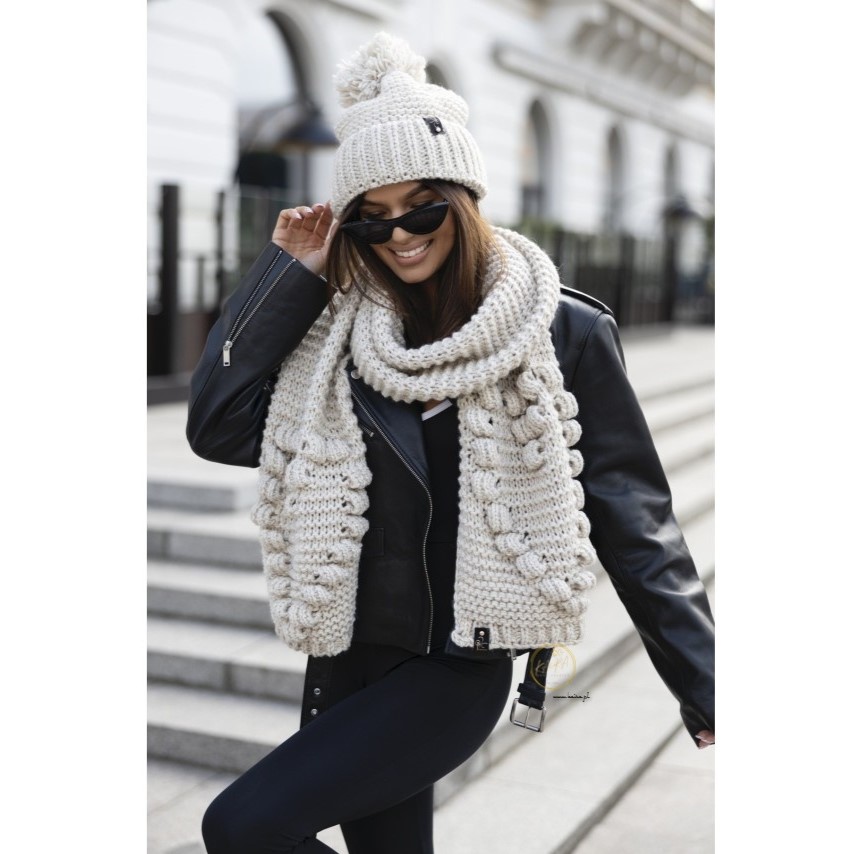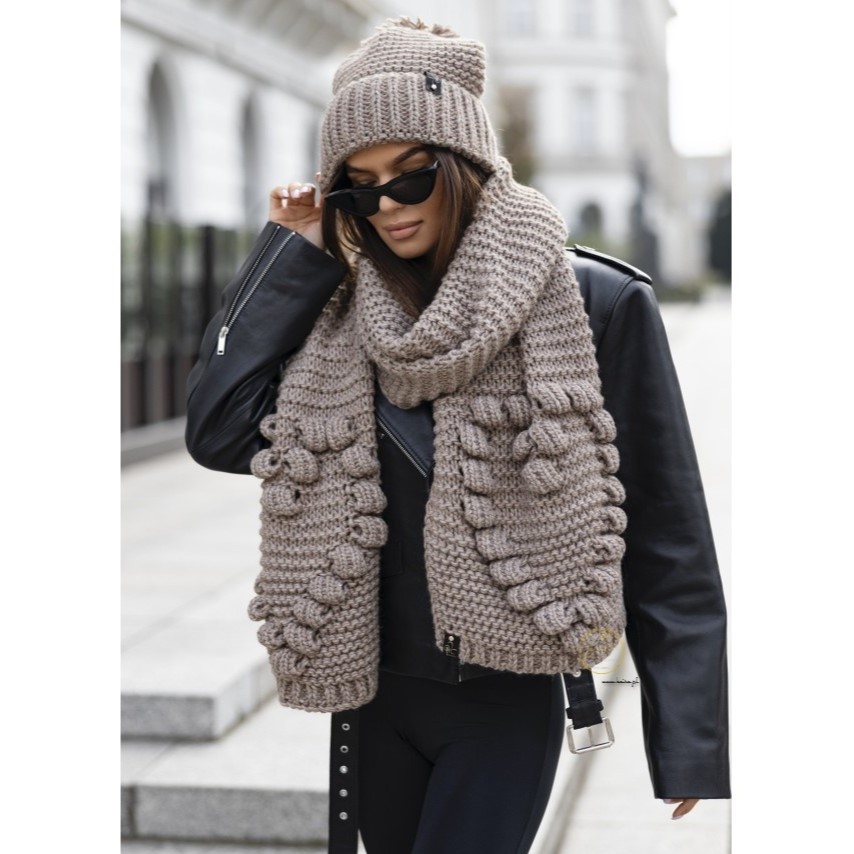 i dodaje uroku. Czapka świetnie dopasowuje się do głowy, zapewniając komfort i ochronę przed zimnem, a szeroki szal można owinąć wokół szyi na różne sposoby, by dodać stylizacji charakteru. Z takim zestawem każda zimowa stylizacja nabierze niepowtarzalnego klimatu.