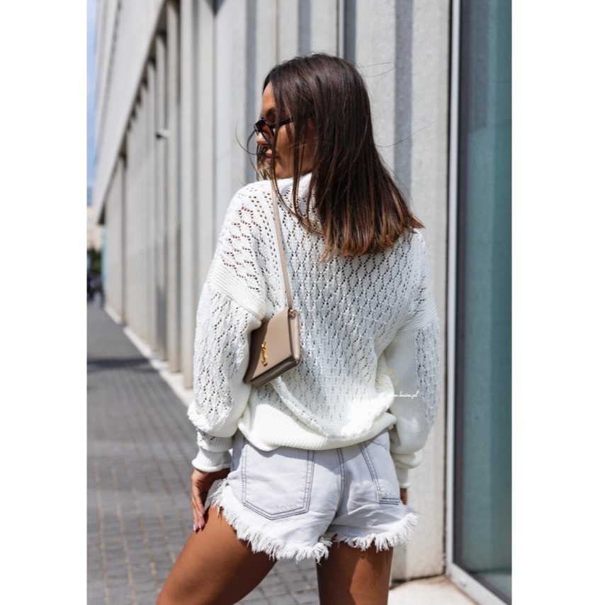 Sweter Abbeli to idealna propozycja na każdą porę roku – delikatny, a zarazem stylowy. Ma luźny, swobodny krój z lekko obniżoną linią ramion, który dodaje nonszalancji i pozwala czuć się komfortowo w każdej sytuacji. Wyróżnia go piękny ażurowy splot oraz duże guziki, które stanowią elegancki detal. Rękawy są długie, zakończone ściągaczem, co podkreśla kobiecą sylwetkę. Sweter ma długość do bioder, więc świetnie pasuje zarówno do spodni, jak i spódnic. Wykonany jest