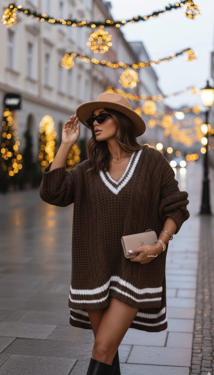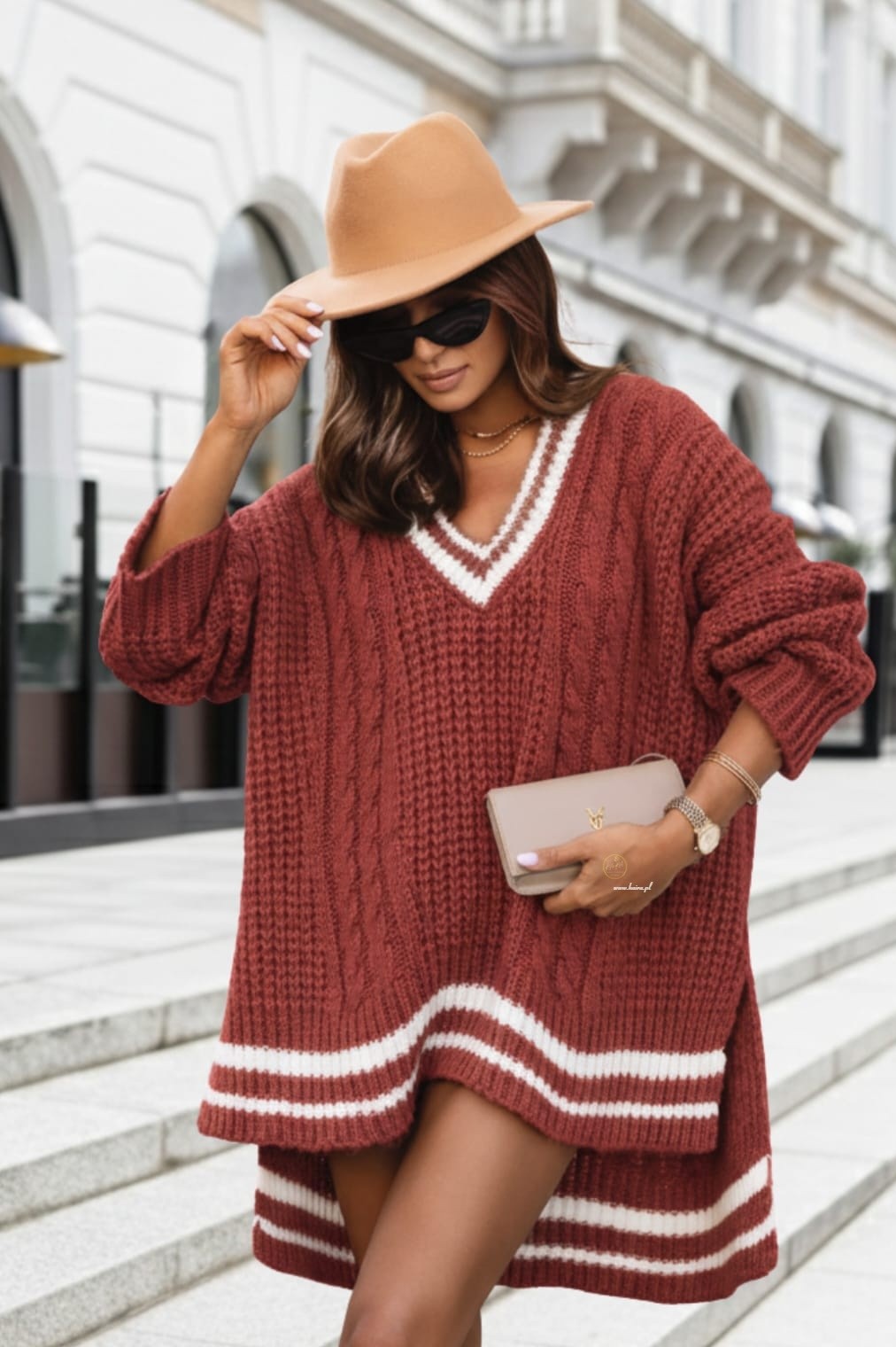 Stylowy, oversizowy sweter ANGELLA to idealne połączenie komfortu i mody! Wykonany z miękkiej dzianiny, o luźnym kroju, zapewniając wygodę, swobodę i ciepło przez cały dzień. Wyjątkowy dekolt w serek i subtelne paski na dodają mu nowoczesnego charakteru.🧶